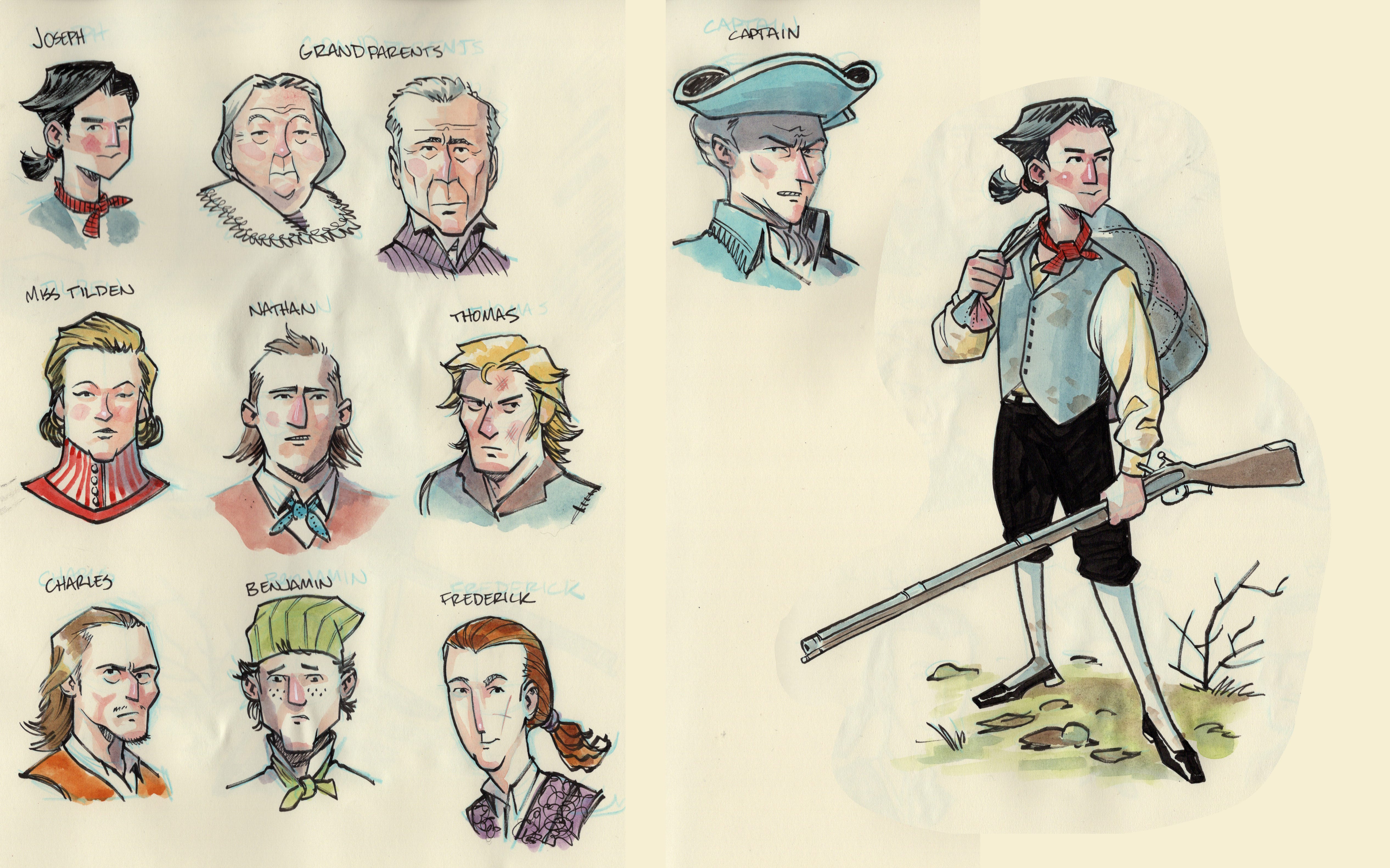 New project siren! I got contacted by a prestigious historical press to work on a graphic novel adaptation of a book about the Revolutionary War. The year of course is fitting, we doubt it will come out this year, but if I put my nose to the grindstone, maybe it will be out in time for Christmas? Here are some character designs.