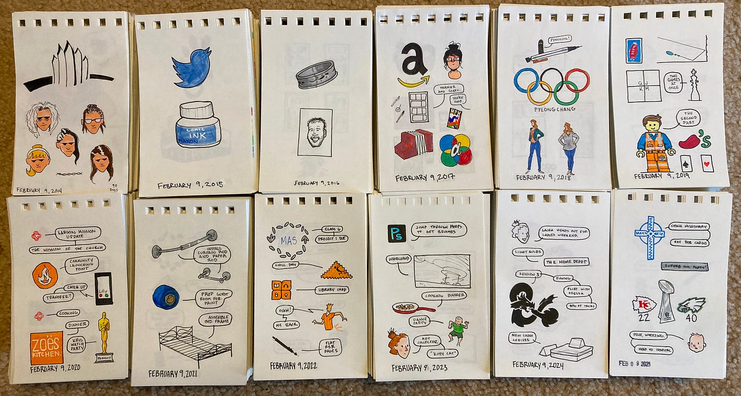 I don’t think I have shared much about this Today’s Sketchy, but over the last 12 years, I have drawn a log of every day on a 4x6 piece of sketch paper. Here is my February 9th for the last 12 years.